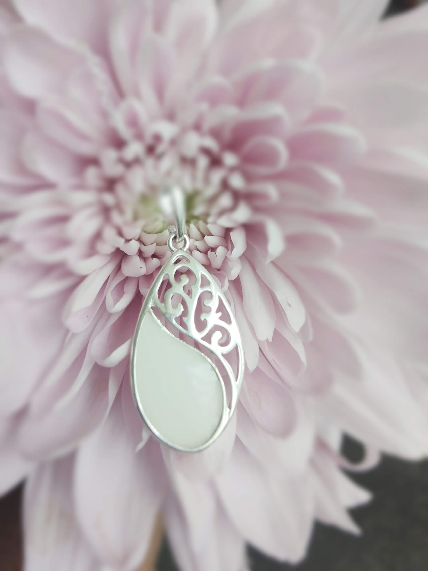 Forever Milkdrops Fancy Teardrop Necklace – A stunning sterling silver pendant featuring intricate filigree and preserved breastmilk, set on an 18″ chain. A timeless keepsake to cherish your breastfeeding journey.