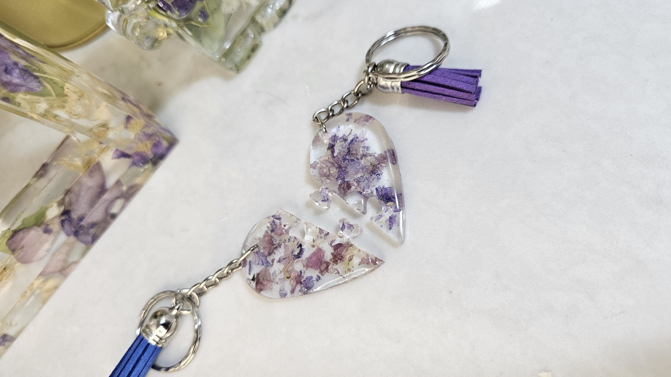 Preserve your cherished wedding flowers forever with our Half Heart Keyring Set by Sals Forever Flowers. This beautifully crafted set includes two resin keyrings, each featuring one half of a heart—perfect for couples, friends, or family members to keep a sentimental keepsake close at all times.