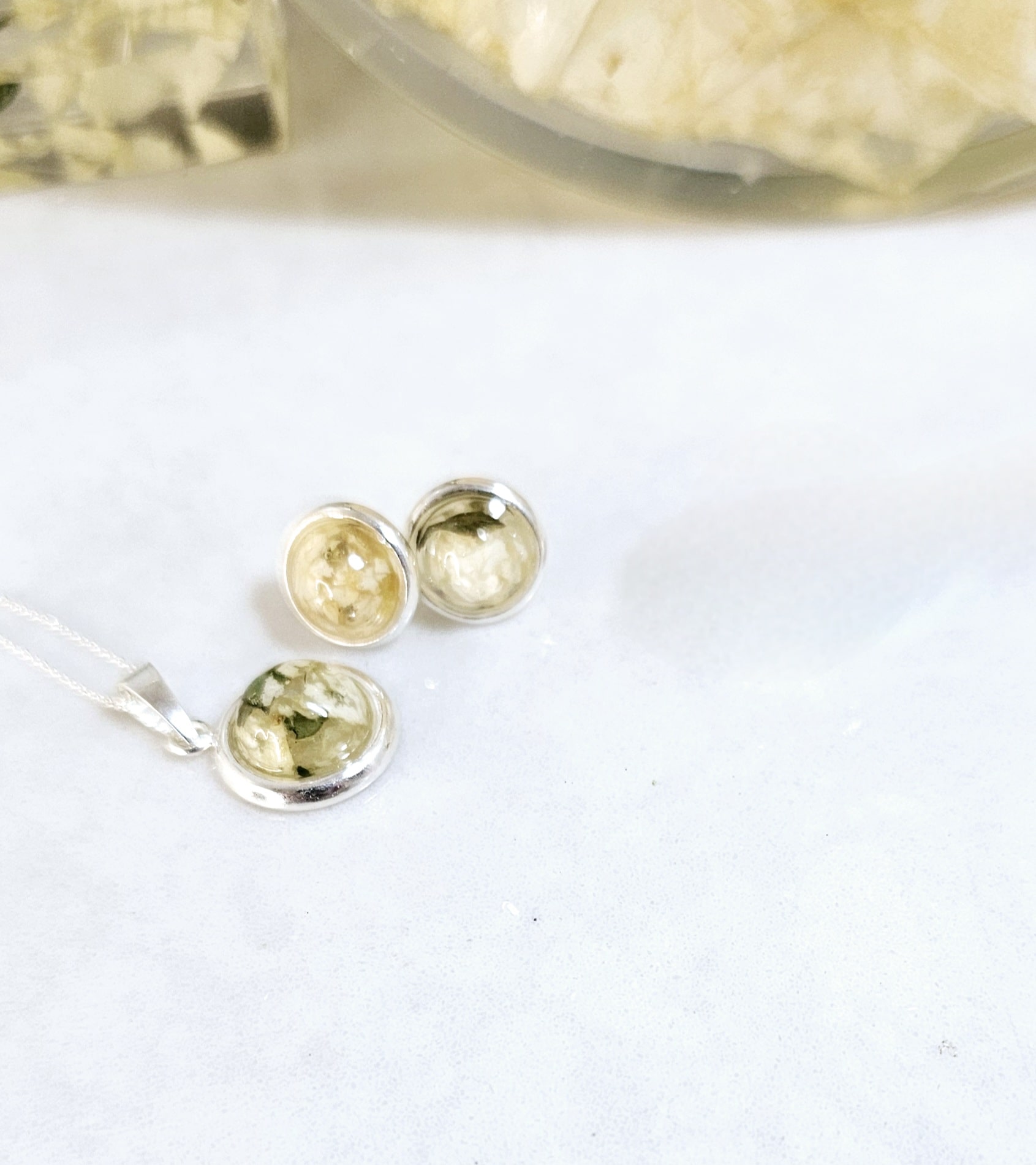 Each piece is lovingly handmade to ensure your floral memories last a lifetime. Choose between the necklace alone, a necklace & earrings set, or the full trio (necklace, earrings, and charm) for a truly unforgettable keepsake