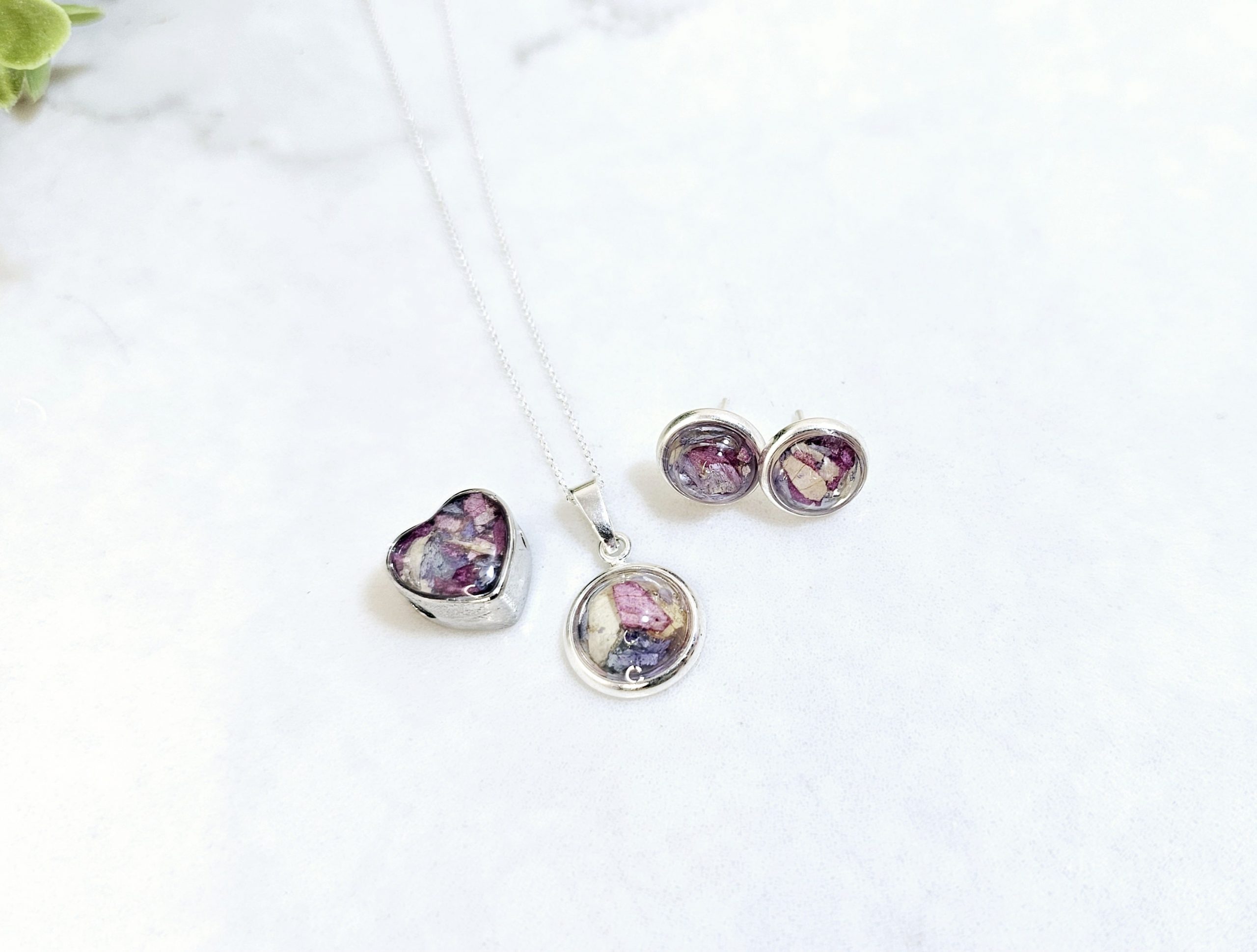 – Necklace: 18″ sterling silver chain with a secure lobster clasp. – Earrings: Delicate studs (optional add-on). – Charm: Compatible with Pandora bracelets (optional add-on). – Setting: Round, smooth-edged resin flower preservation in sterling silver.